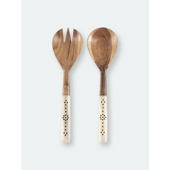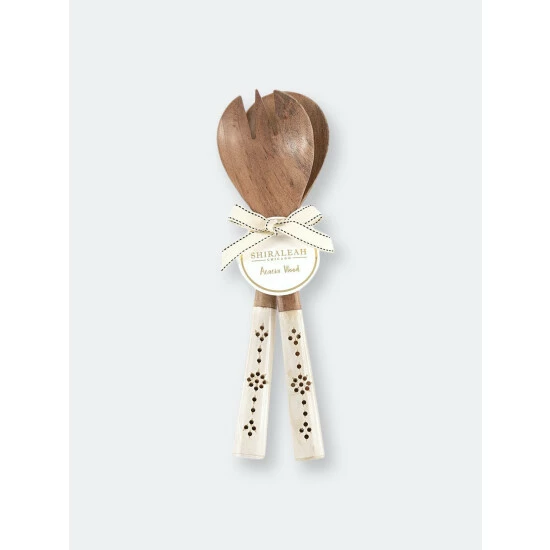 Bring a refined yet chic impression to your dining table with Shiraleah’s Arjuna Salad Servers. This set features one serving spoon and a three-tine rounded serving fork, perfect for tossing and serving a variety of dishes. Made from acacia wood and bone, these salad servers are highly durable, eco-friendly and light weight, giving them a sophisticated and natural look without compromising functionality. Measuring L 12″ x W 2.5″, and packaged ribbon wrapped, the Arjuna Salad Servers are the perfect addition to your serveware. Pair with other items from the Shiraleah home collection to complete your look!