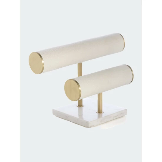 Keep your jewelry on display and organized at the same time. This two tier bracelet stand is made of jute and brass with a sturdy marble base. This stand will instantly elevate your dresser or vanity.