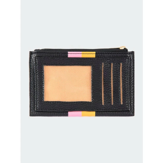 – Top zip closure- 1 outer slip pocket- 2 credit card slots- Id window- Vegan- Pebble grain polyurethane- Gold hardware