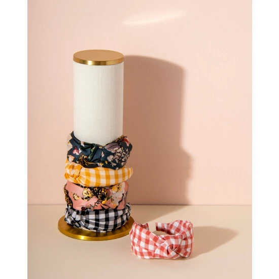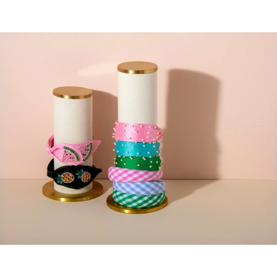 Keep your hair accessories organized with the shiraleah tall headband display stand. Elevate your vanity or dresser and keep your headbands organized at the same time. The stand measures 16 inches tall and is made of brass and jute.