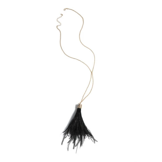 – Steel and ostrich feather- Paper bag- L 17″, extender 3″, pendant L 6.5″ x W 1″